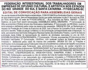 ASSEMBLEIA GERAL EXTRAORDINÁRIA – 18 de março de 2026 FEDERAÇÃO INTERESTADUAL DOS TRABALHADORES EM EMPRESAS DE DIFUSÃO CULTURAL E ARTÍSTICA NOS ESTADOS DO RIO GRANDE DO SUL E SANTA CATARINA – FITIDECA/RS-SC EDITAL DE Veja mais »